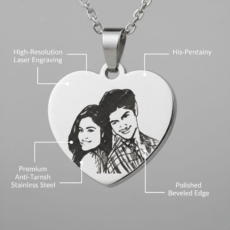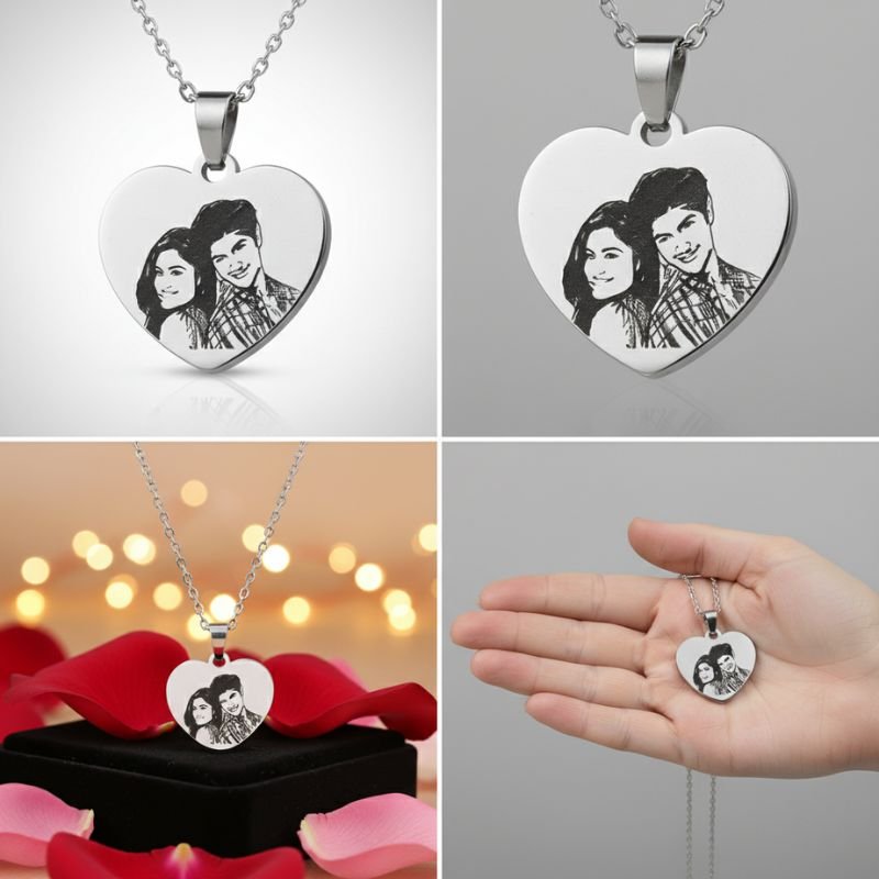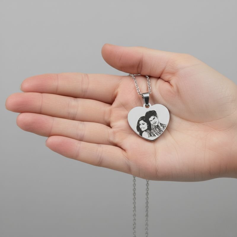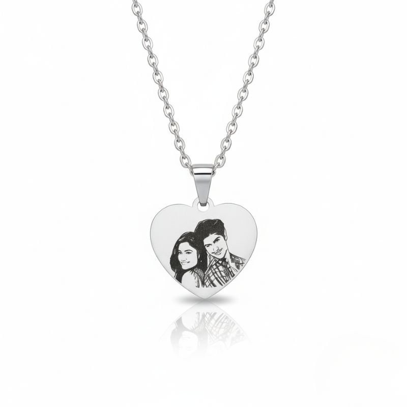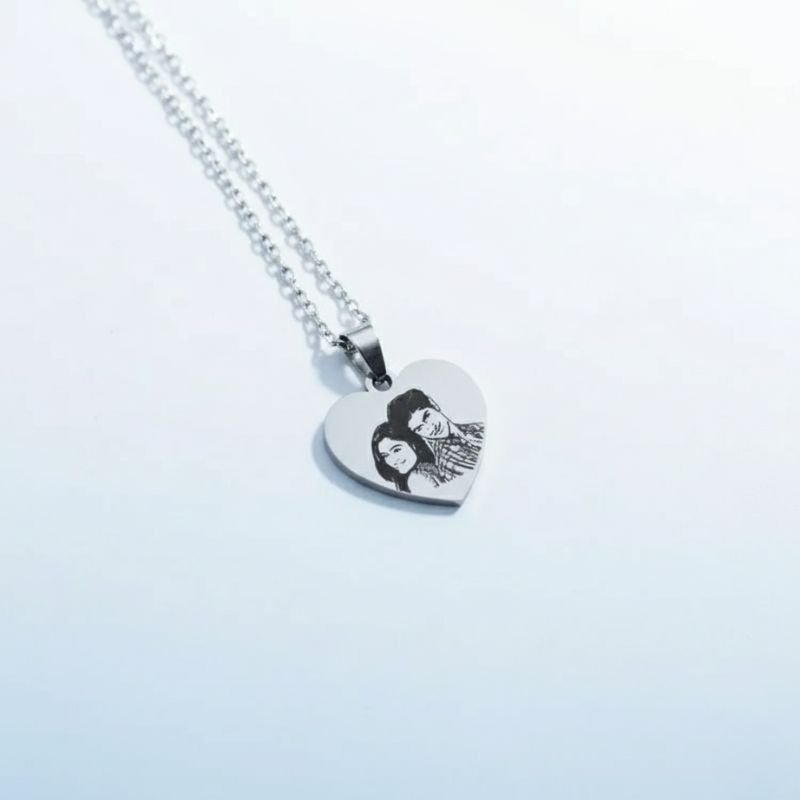 - Custom Engraving: Your own photo engraved on a heart-shaped stainless steel pendant.