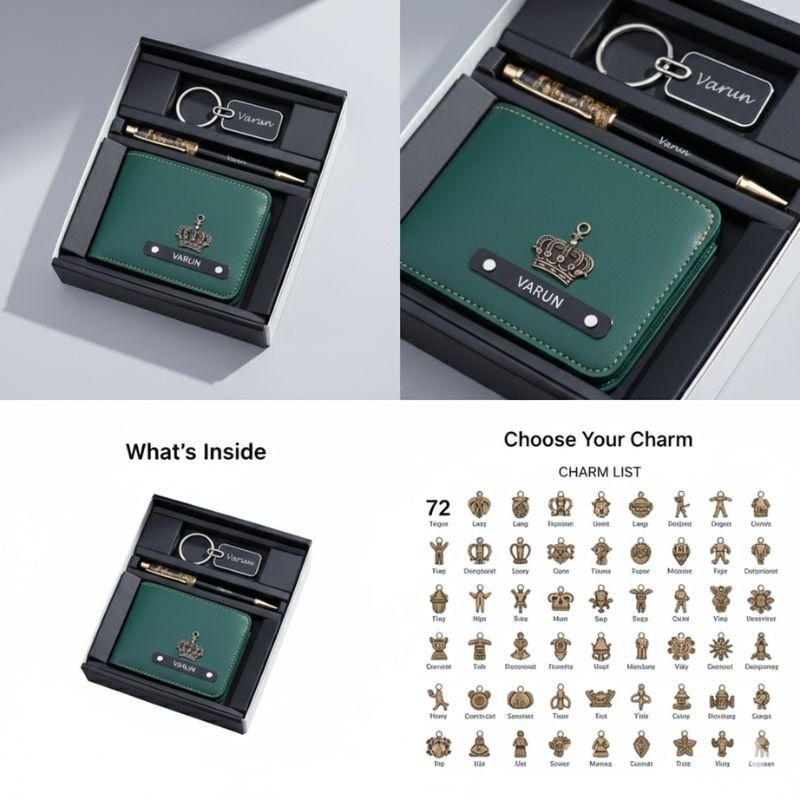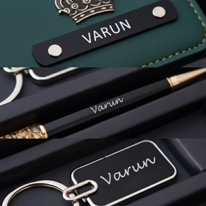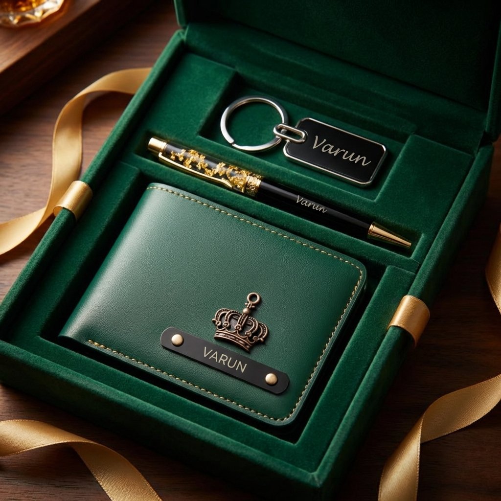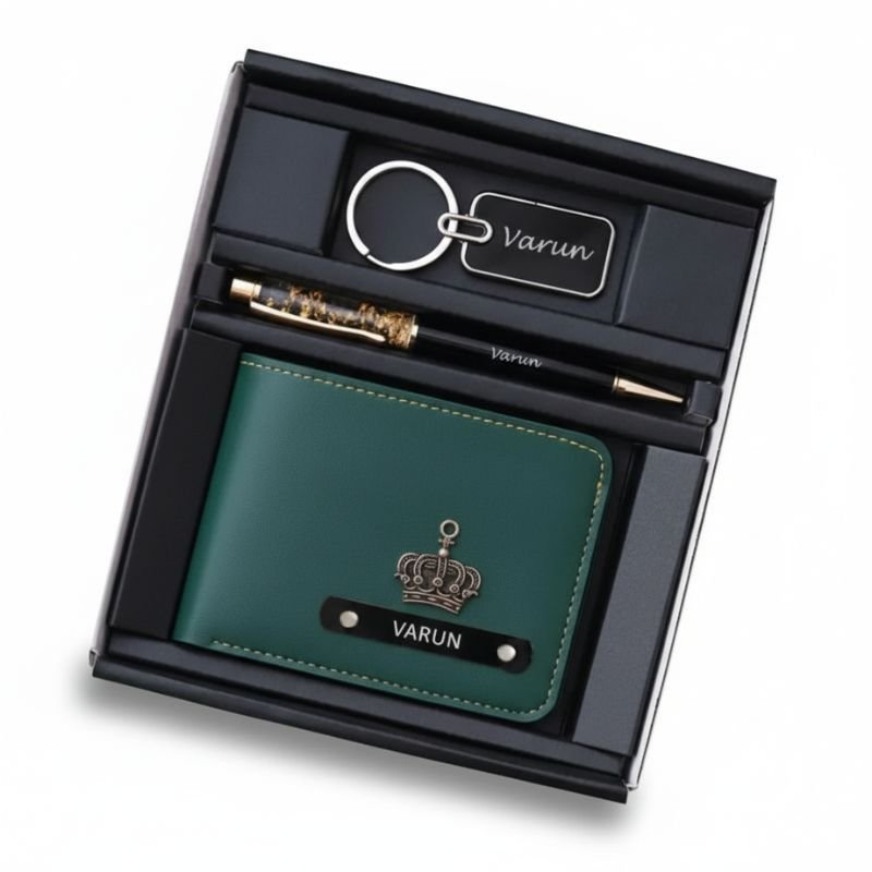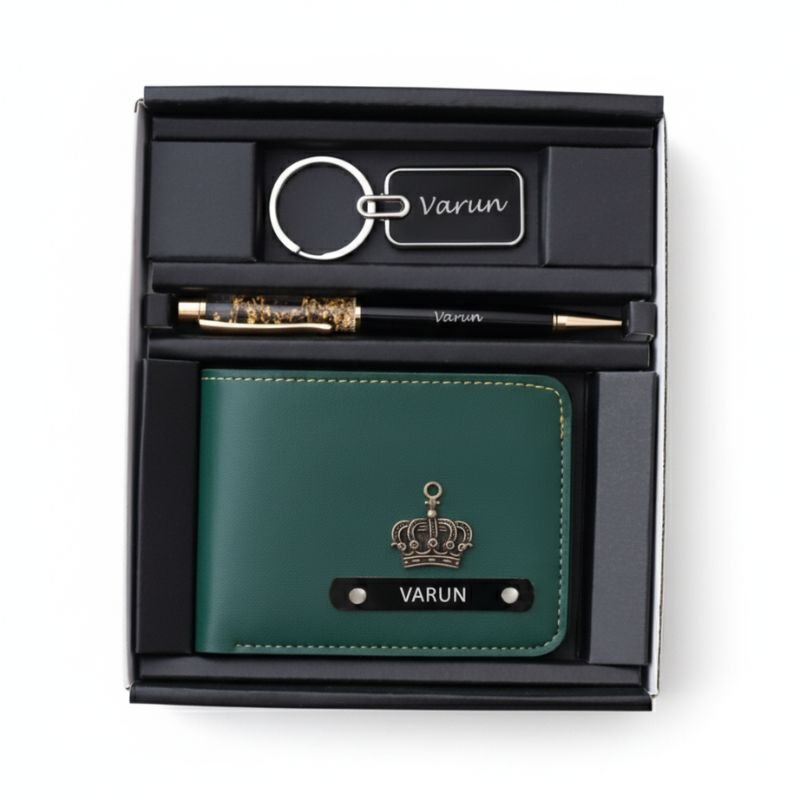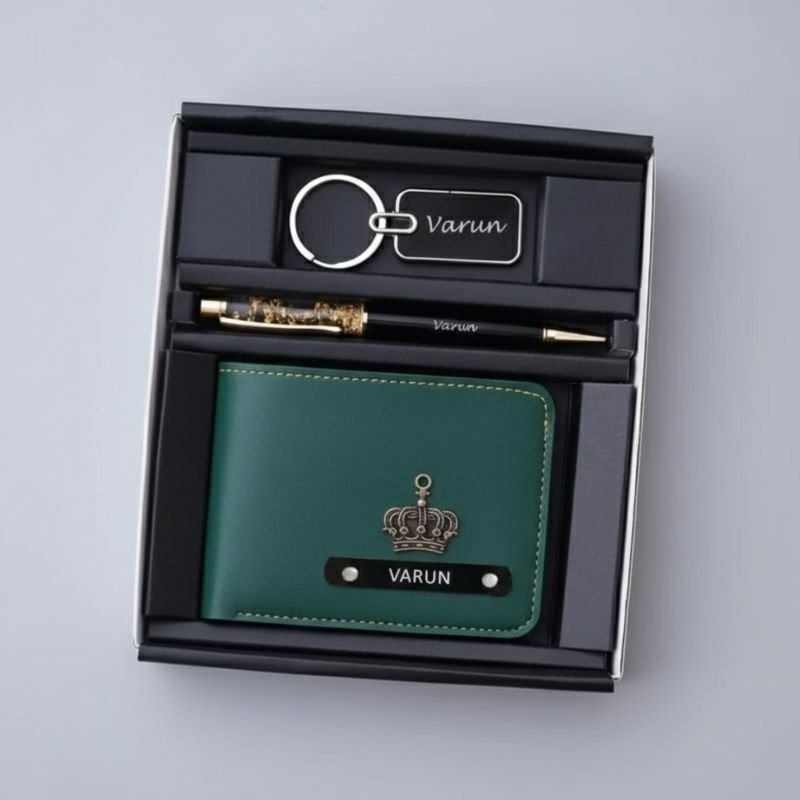 Make gifting memorable with this Premium Executive Gift Set featuring a luxurious combination of style and personalization. Each set includes a name-engraved wallet, customized metal pen, and personalized keychain, beautifully arranged in a high-quality gift box.